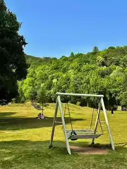 There is a long rainbow slide, a big swing, a seesaw, and a small slide.
