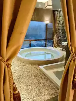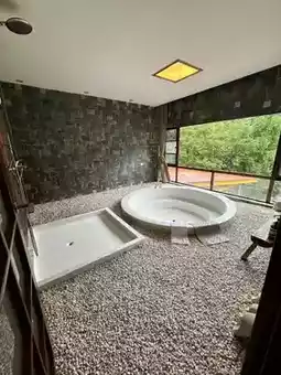 ✔️The private hot spring with mountain view♨️ is absolutely amazing. The most famous feature is the rose bubble bath, which is really beautiful and very photogenic. The bathtub is big enough that you can enjoy the mountain view outside the window while soaking in it. The room is clean and the shower gel is Zen essential oil which smells good.