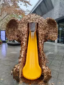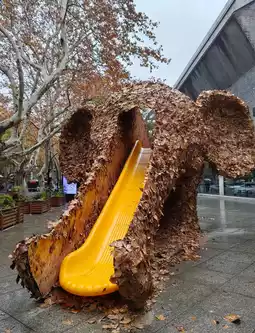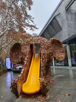 Among the leaf sculptures, the most popular is the little elephant leaf slide! The first person to think of making an elephant's trunk into a slide is a genius!