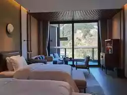 As soon as we got out of the car, the fresh air hit us, and it felt like even our breathing became lighter. The hotel is built on the mountain, and its simple architectural style blends in with the surrounding natural landscape, like a traditional Chinese ink painting.