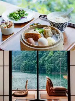 3. In terms of dining, the B&B's restaurant specializes in Chinese and Japanese cuisine. Sit by the river and satisfy your hunger with delicious food and stunning views. There's also a café, with offerings comparable to trendy coffee shops in the city, paired with fruit desserts for a delightful experience. Want to get closer to nature? There's a picnic area where you can gather around a stove for tea, camp, and enjoy life to the fullest.
