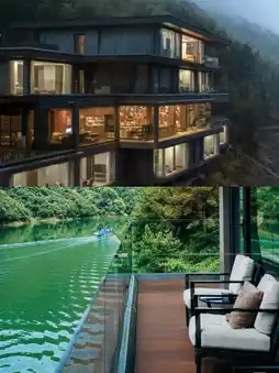 5. Born Wild · Shendu Wubei is located in a remote mountain fishing village in Lin'an, Hangzhou, known as "the most beautiful fishing village in western Zhejiang" and "the most beautiful village in Hangzhou." It's close to Liuxi River, faces the green mountains, boasts a first-class river view, and allows you to appreciate the hidden beauty of this picturesque landscape. Every corner of the common area has oversized floor-to-ceiling windows, the frames of which resemble picture frames, capturing the river and mountain views. During a morning stroll, I also noticed another nice place, Bright Moon Among the Pines.