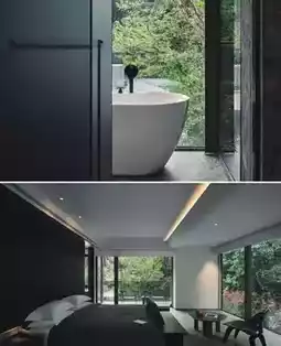 The color tone is mainly gray and black, integrating sharp lines and restrained colors, blurring the boundary between mountains and luxury. The public areas are full of hidden sceneries: the tea house and the "Qingquan Stone" landscape complement each other, and a mountain spring flows down in the backyard; the "Huanxisha" infinity pool reflects the sky and clouds, and the camping lawn "Tashaxing" can be used for weddings and team building.