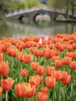 College of Civil Engineering by Qizhen Lake – There’s a lakeside field full of blooming tulips, with two large patches of Chinese violet cress nearby.