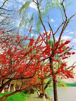 The weeping willows of Liulang Wenying gently brush the lake, reflecting the blue waves, forming a moving picture. The lake is sparkling, with koi swimming through it, and egrets skimming over the water, leaving poetic ripples. Mandarin ducks play in the reeds, the warm sun shines down, and the fragrance of flowers fills the air. Every step feels like walking in a painting.