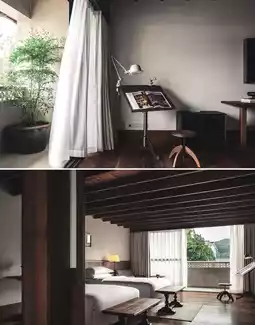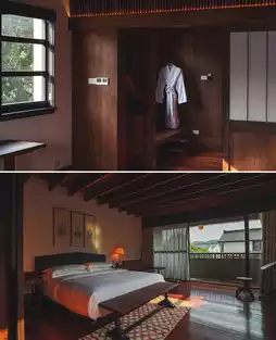 The hotel was designed by designer Fang Lingjia, continuing the simple architectural style of ancient Hangzhou, with logs as the keynote, matched with simple wooden furniture and warm lighting, creating an oriental aesthetic space of "great hermit in the city". The three-story building is hidden among the trees, and the courtyard is full of different scenery. The tea room, reading room, and outdoor garden are cleverly connected. The light and shadow flow shows the gentle beauty of Jiangnan.