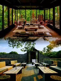 Located in the heart of the main West Lake scenic area, it is within walking distance to the Hupao Spring. Three buildings are surrounded by bamboo paths, with courtyards featuring wedding lawns and scenic ponds. Amidst the swaying tree shadows, it feels like traveling back to a 1934 summer villa. The architect uses glass curtain walls to bring the mountain light indoors, where old fireplaces and contemporary artworks converse warmly, and even the air conditioning vents are hidden behind carved wooden grilles.