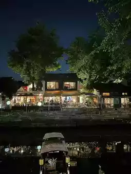 ✨ The highlight of this area is the ancient canal that runs parallel to the street. Small bridges cross over it, and you can spot tiny wooden boats gliding by—a scene that’s both classic and serene.
