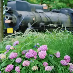 Stepping into the park feels like traveling through time! The century-old White Pagoda stands solemn and mysterious, while the nearby railway tracks, covered in gravel, host a vintage green train quietly parked 🚂. Sunlight filters through the train cars and tracks, creating scenes reminiscent of old movies. The seasonal highlight is the early summer bloom of hydrangeas—clusters of blue and purple flowers adorning both sides of the tracks, making for a perfect Japanese-style photo op 🌸.