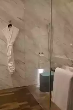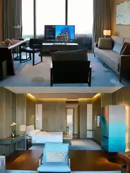 The public areas of Hangzhou Park Hyatt are grand, while the rooms are meticulously detailed. From the ground floor lobby to the 37th-floor check-in area, the high ceilings combined with Yabu's signature neo-Chinese design—featuring marble or metal light fixtures extending to the ceiling—create an aura of opulent grandeur. The rooms are adorned with plum blossom motifs and teal accents against dark wood finishes. The plum blossom lighting on the headboard only reveals itself at night, a subtle yet thoughtful touch.