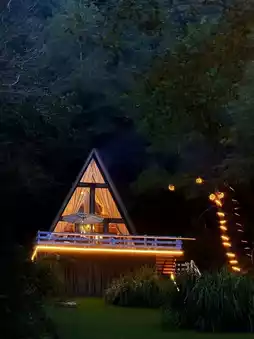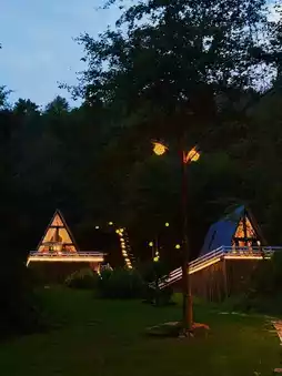 Lin'an Banmu Tang: Off-season serenity, where wooden cabins and starlight create a picturesque retreat.