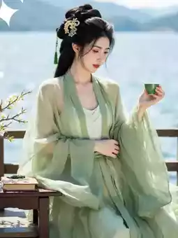 - Jade and light red hanfu complement the waterfront backdrop, and wrapping the sleeves around your fingertips creates a softer effect.