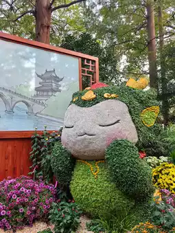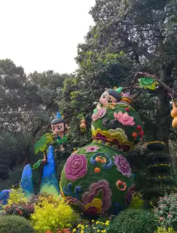 The chrysanthemums here hold diverse romance. Among the more than 1,200 exquisite chrysanthemums in the Yuquan Fish Leap Scenic Area, there are both national treasures and overseas newcomers. Tower chrysanthemums rise like peaks, cliff chrysanthemums resemble waterfalls, poetically reflecting with the Yuquan koi. Fifteen artistic installations hold more surprises: "Gourd Child Memories" awakens childhood memories with chrysanthemums and vines; "Flowers Blooming on Hangcheng Road · Digital Blossoms" sparks technological romance with drone flower waterfalls and robot dogs; "Mandarin Fish Wave Fishing Fire," made from recycled old clothes, tells the philosophical story of circular ecology.