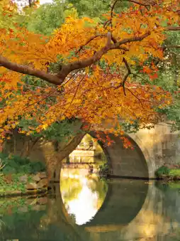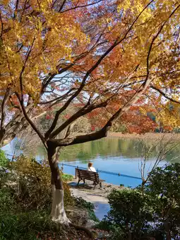 Walking under red maple trees, mandarin ducks playing in the blue lake,