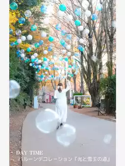 Balloon decorations on the tree-lined path leading from the entrance🎈