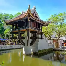One Pillar Pagoda is an ancient pagoda in Vietnam built during the reign of King Ly Thai Tong, also known by many different names such as Mat Pagoda, Lien Hoa Dai or Dien Huu Tu. During the Ly Dynasty, the pagoda was located on the land of Thanh Bao village, Quang Duc district, west of Thang Long Imperial Citadel. Today, the pagoda is in Ba Dinh district, located in the park behind Ong Ich Khiem street, next to the Ba Dinh Square complex and President Ho Chi Minh Mausoleum. Because it is located in the complex of Ba Dinh Square and Uncle Ho's Mausoleum, the time the pagoda is open for visitors also depends on these two locations. Accordingly, the temple will welcome guests from 7am to 6pm daily. The duration for each tour usually ranges from 1 to 3 hours. The temple's architecture is inspired by the image of a lotus flower blooming on the water. Lotus is the national flower of Vietnam - a flower representing nobility, sharing and love, a noble symbol of dignity. The overall project includes items such as Lien Hoa Dai, Linh Chieu Lake and stairs to the main hall.