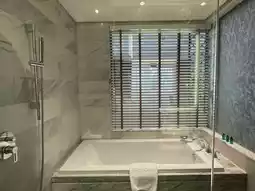 The shower water pressure and temperature are good, and the bathtub is spacious.