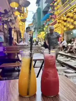 🫖🍵 We can go and order drinks, tea, coffee, juice, or sip beer and watch the train at the same time. When we actually went to sit, it was very exciting because the train was coming fast and strong. We had to choose a shop and a safe corner. The price of the drink was not very high.
