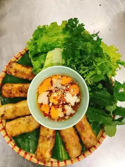 The standout dish, cha ca, features marinated fish cooked to perfection, served sizzling with a medley of fresh herbs, vermicelli noodles, and peanuts. Diners are encouraged to assemble their own bowls, creating a personalized dining experience. The flavors are vibrant, combining the richness of the fish with the freshness of the herbs.