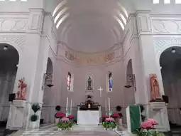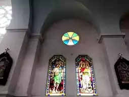 The spacious interior of the church is decorated with stained glass windows depicting saints. It looks like a closed church, but it is open to the public.