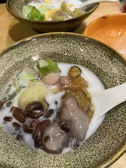The gently sweet coconut milk is topped with beans, fruit, tapioca, and more, creating a jam of colors, ingredients, and textures. 🤭