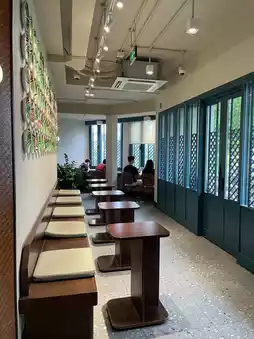The store's minimalist, modern exterior contrasts seamlessly with the surrounding traditional street houses. Inside, there's ample seating on the upper floors, creating a stylish and inviting atmosphere perfect for working with a laptop or just chilling out with friends.
