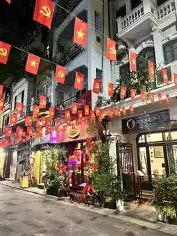 • Day 1 Walk in the Old Quarter, streets with flags, small cafés, evening atmosphere.
