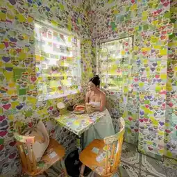 • A cafe filled with colorful post-it notes. They're posted throughout the shop.