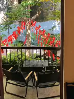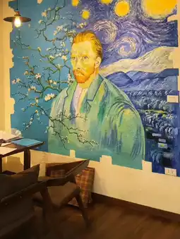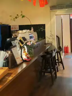 The concept of Hom Nao revolves around simplicity and the feeling of being 'at home.' The interior design features warm tones, blending wooden furniture with vintage-style decorations. These include floral tablecloths, small potted plants, and old movie posters.