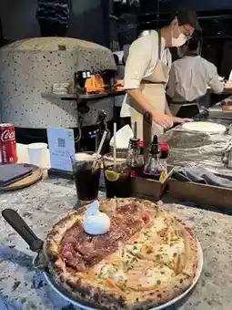 The noodles, as soon as you put them in your mouth, burst with shrimpy flavor, almost like the shrimp dancing in your mouth. Then, you're greeted by the aroma of basil. The dough, asparagus, king oyster mushrooms, and shrimp are crispy and sweet, creating a layered texture. The pizza was delicious. 6296400$800
