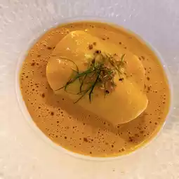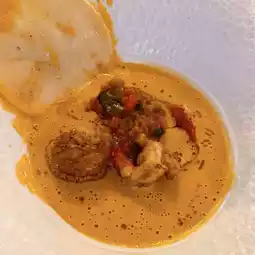 Scallops & prawns ravioli, grilled chorizo & ratatouille, lemon leaf peanut crumble, smoked paprika bisque emulsion