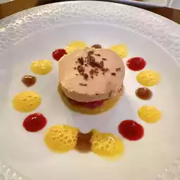 Duck foie gras terrine, lychee & red fruit frangipane in Amaretto liquor, blackcurrant glaze & saffron emulsion