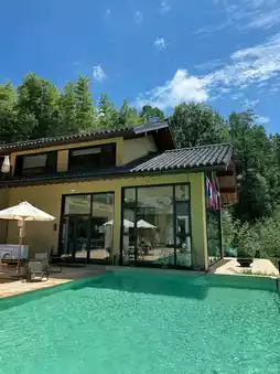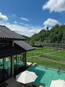 ✅ The pool by the fields, the second-floor book bar, and the mountain-view terrace outside the rooms are all sources of their happiness~