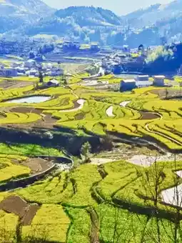 Stepping into the ancient terraces of Fengyan in Hanyin during early autumn feels like walking into a vast, flowing painting. The terraced fields cascade along the mountain slopes, resembling golden waves sculpted by nature's hand. Distant mountains are cloaked in verdant hues, with light mist swirling gently, creating a picturesque harmony with the shimmering water surfaces between the ridges. A soft breeze rustles through the rice stalks, whispering tales of millennia-old agricultural traditions. These terraces, weathered by time, still retain their ancient irrigation wisdom. The winding water channels, like the veins of the earth, slowly deliver life-giving streams.