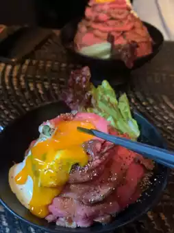 Thin, tender slices of roast beef are piled high like a mountain on top of rice. A soft-boiled egg 🍳 is placed on top, complemented by a creamy mayonnaise-style sauce and a soy sauce-based special sauce that blend harmoniously.
