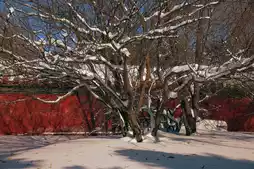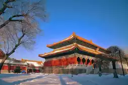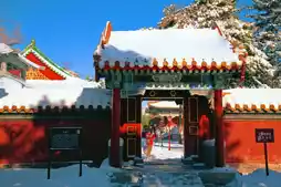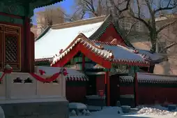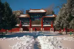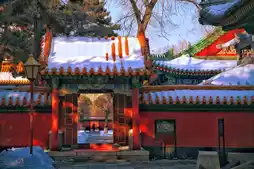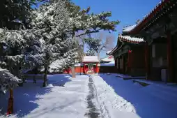 There are red walls, golden glazed tiles, green pines and cypresses, and quiet paths. Against the backdrop of white snow, it feels like you are in the Forbidden City.