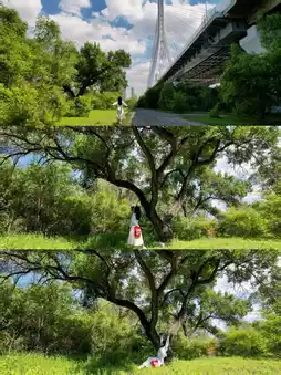 ✓Use a telephoto lens, shoot from a distance with the person standing under a tree