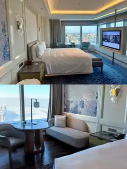 The Manor on the 54th floor is a full-time Western restaurant, where breakfast and buffet dinner are served. There are rich varieties and the taste is also very good. The Chinese restaurant Jinghuangxuan on the 55th floor specializes in Cantonese cuisine and some Northeastern dishes. You can dine in the sky while enjoying the beautiful scenery. There is also Flair, a restaurant and bar high in the clouds, which offers Southeast Asian snacks and a variety of special cocktails. Come here for a drink in the evening and overlook the night view of the city. It is really atmospheric.