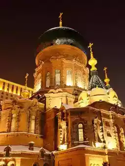 Day 1: Arrive in Harbin and check into accommodation near Harbin Institute of Technology (HIT) because a friend is studying Chinese there. In the evening, stroll around Zhongyang Street, which has many shops selling food and winter gear. It's recommended to buy winter gear here as it's cheaper and warmer than what you can get in Thailand. Saint Sophia Cathedral is very photogenic in the evening. We mainly travel by taxi since there are three of us, and the meter fare is not expensive. P.S. There are many affordable restaurants in the university area.