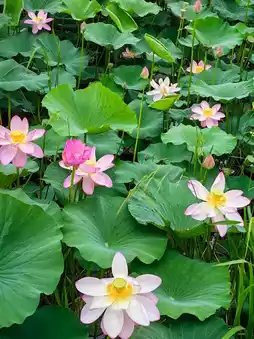 The lotus pond at Harbin Cultural Center is vast and currently in full bloom. Strolling along the boardwalk amidst the lotus leaves, you'll encounter deep pink, light pink, and white blossoms over 20cm in diameter. Half-opened flowers reveal glimpses of tender yellow pistils swaying in the breeze, while delicate buds blush charmingly. Fresh green lotus seed pods dot the scenery, and expansive emerald leaves stretch gracefully - a perfect summer tableau!