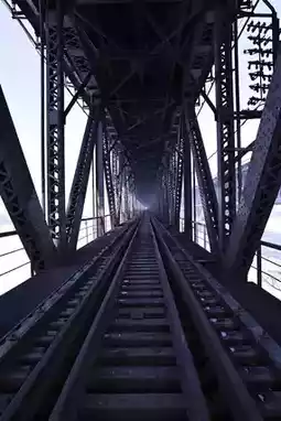 The rust-colored tracks stretch to the horizon, with flowing clouds reflected on the river surface. Perfect for shooting silhouettes, stylish trench coat photoshoots, full of cinematic feel.
