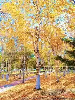 No need to drive far to the suburbs, a hidden autumn surprise awaits right in downtown Harbin—the garden at the main entrance of the Second Hospital of Harbin Medical University is blooming with limited-time golden romance. The birch leaves have turned yellow, fallen leaves form a soft path, and with benches in the forest, every casual shot looks like a cinematic scene, often overlooked even by locals.