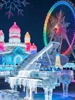 The colorful ice sculptures are simply magical — from the radiant ice version of Saint Sophia Cathedral to the giant snowman, every corner glows like a dream. ⛪☃️