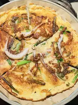 🐙 Seafood Pancake — packed with squid and veggies, crispy on the outside, soft and eggy inside. Dip it in soy-chili sauce for that chef’s kiss moment.