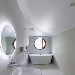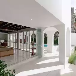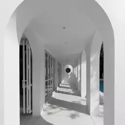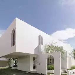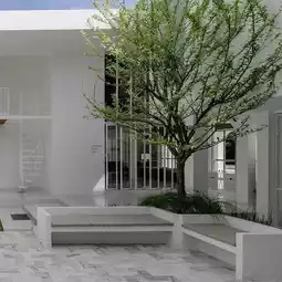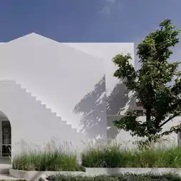 Using bright white tones throughout the building, contrasting with the green of the trees