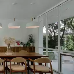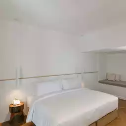 The rooms are in a modern style, using wooden materials contrasting with white walls