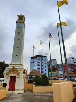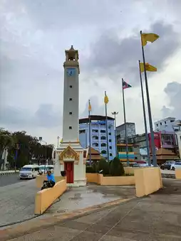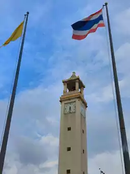 The clock tower in Hat Yai, Thailand, stands tall along the Heart of Hat Yai Road. It's an imposing structure adorned with numerous flags around its perimeter.