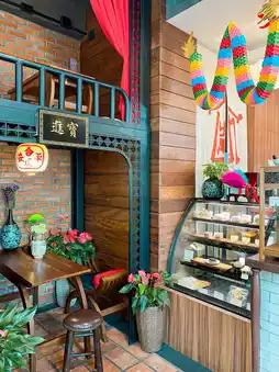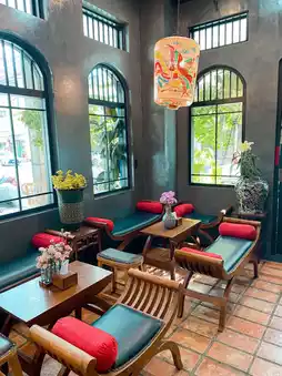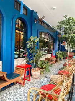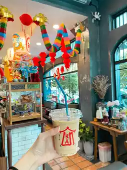 Visited this pretty café in the heart of Hat Yai city and it was such a hidden gem! The café is a hostel-café combination, but we were just there for a cuppa! Love the building, vibrant in blue with unique fan design at the balcony areas. The interior is inspired by modern oriental designs, with dangling lanterns and Chinese wordings in store. The café was cozy and comfortable, felt welcoming! The seats were pretty limited, and might not be suitable for larger groups of visitors to hang around. We ordered iced latte for to go and latte was well balanced with good shot of coffee!
