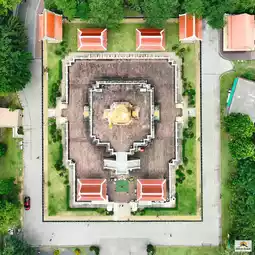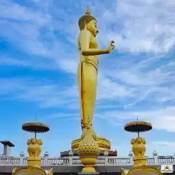 🍀🌿🚠 It is a separate piece cast brass Buddha statue. When assembled, it is 19.9 meters high (excluding the base) and weighs 200 tons. It is in the attitude of subduing relatives and faces Hat Yai City. It can be reached by a double-track cable car, 525 meters from Thao Maha Phrom Station to Phra Phuttha Mongkhon Maharat Station.