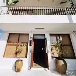 • The upper floor requires taking off your shoes. There is a seating area by the window, cushions, light-colored sheets, and a light view of the trees